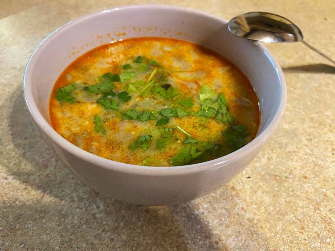 Скажу честно, до этого я ни разу не ела сама этот тайский суп, но домашние любят, так пробовала у кого то из тарелки! Ну раз любят решила сделать дома! Рецептов массу, их есть разные виды, но сделала по рецепту напоминающий тот, что моим нравится! Блюдо не бюджетное, найти ингредиенты тот ещё квест, но это того стоило! Ингредиенты: целая курица , грибов вешенок , кокосового молока , рыбного соуса , сахара , сок 1 лайма, креветок королевских , суп-основа том ям , стебель лемонграсса , листья каффир-лайма , галангал , перец Чили , кинза , помидоры Черри Способ приготовления: Основа супа это крутой, куриный бульон, поэтому нам и нужна вся курица, моем ее и варим в кастрюле для будущего супа, как будет готова вытаскиваем и она больше нам не понадобится - готовим все ингредиенты, моем, чистим, пока отваривается курица Как бульон готов, доводим до кипячения и добавляем туда лемонграсс, листья и галангал, варим 15 минут и вынимаем «корешки» Убавляем огонь, чтобы не было бурления, добавляем па
