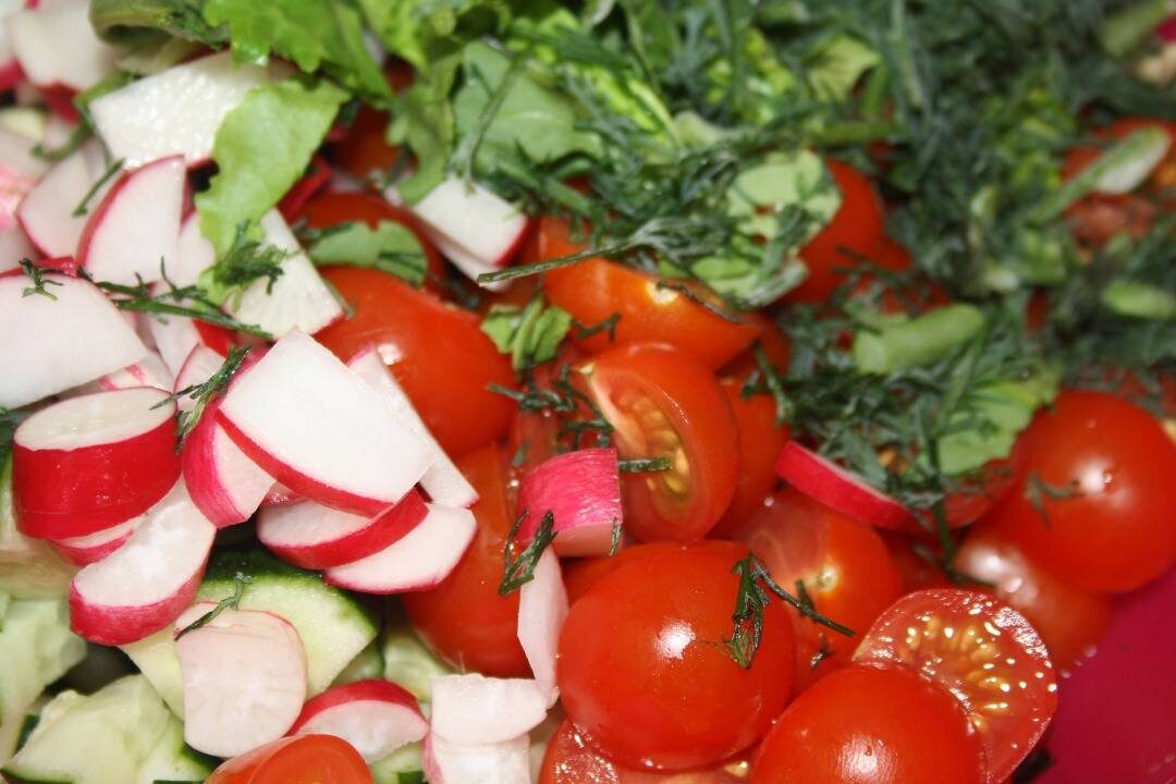 #летнееменю У нас в огороде, уже пошли первые огурчики, зелень и редиска:) Рецептик покажу и похвастаюсь:) Ингредиенты: Огурцы (количество по Вашему вкусу), Редиска (количество по Вашему вкусу), Помидорки Черри (количество по Вашему вкусу), Листья салата (количество по Вашему вкусу), Укроп (количество по Вашему вкусу), Масло или майонез Способ приготовления: Огурчики нарезаем кубиками или тонкими пластиками. У меня на салат ушло 3 штучки среднего размера. Каждую помидорку Черри разрезаем на две половинки. Редиска с огорода самая вкусная и самая сочная. Она является украшением салатика:) Листья салата нарезаем по Вашему вкусу. Добавить укроп. Заправить по Вашему желанию:) Я например люблю с оливковым маслом, а муж с майонезом:)