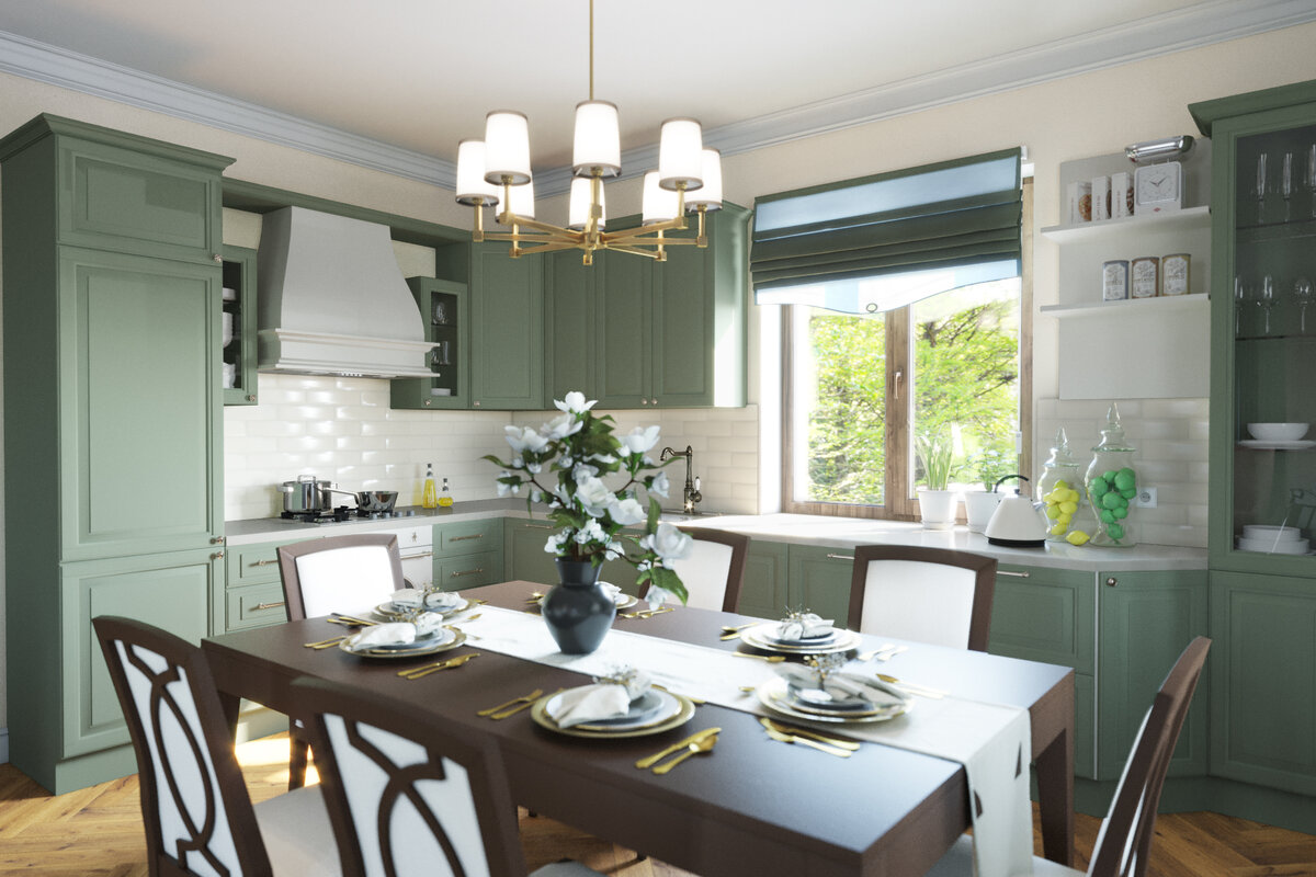 ЗЕЛЕНАЯ ГОСТИНАЯ-СТОЛОВАЯ С ОКНАМИ В САД Площадь 46 кв. м. Сложность планировки этой гостиной в ее геометрии: помещение узкое и вытянутое с двумя входами. Зеленая гостиная – столовая предназначена для семьи, которая любит принимать много гостей в своем загородном доме. Ощущение близости к природе и уютная обстановка для общения друзей – вот основные приоритеты, от которых отталкивались при создании интерьера этой гостиной-столовой. Был выбран стиль «А ля американская классика», благо площадь позволяет развернуться! Стол, стулья, диваны достаточно крупных размеров, удобные, надежные, располагающие к долгим посиделкам и разговорам по душам. Много окон с видом в сад и на лес. Хозяин дома хотел, чтобы природа проникла и в интерьер гостиной. Желание полного воссоединения с природой выразилось и в подборе материалов. Все они максимально экологичные. В первую очередь, это, конечно же, натуральный дубовый паркет с сучками. Вернувшаяся мода на укладку паркета «елочкой» придает особое очарова