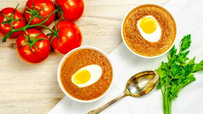 Способ приготовления Несмотря на то что это сочетание продуктов кажется нежизнеспособным, поверьте, вкус у этого летнего супа будет потрясающим. Готовится он очень быстро и просто. Томаты ошпарьте кипятком и снимите кожицу. Клубнику помойте и удалите хвостики. От мелиссы оставьте только листики. Хлеб очистите от корок и замочите в воде. Теперь все ингредиенты измельчите в блендере, добавьте соль, немного перца и обязательно протрите через сито: в супе недопустимы семена или остатки кожуры. При подаче добавьте яйцо и лед. Понравился рецепт? Поставь лайк и подпишись на наш канал! Присылайте свои рецепты на vecher@vm.ru, и лучшие из них появятся здесь.