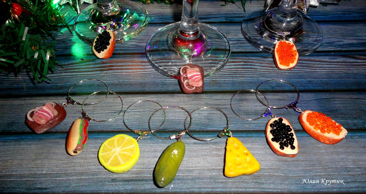 Маркеры для бокалов-еще один вариант использования миниатюрных фигур овощей, фруктов или других вкусностей. Очень часто, во время застолья, путаются местами бокалы и рюмки и начинаешь сомневаться в том, свой ли бокал ты взял или бокал соседа. В таких случаях, маркеры для бокалов - просто незаменимая вещь! Они легко снимаются и надеваются на бокал. Использую их с удовольствием сама и дарю друзьям.