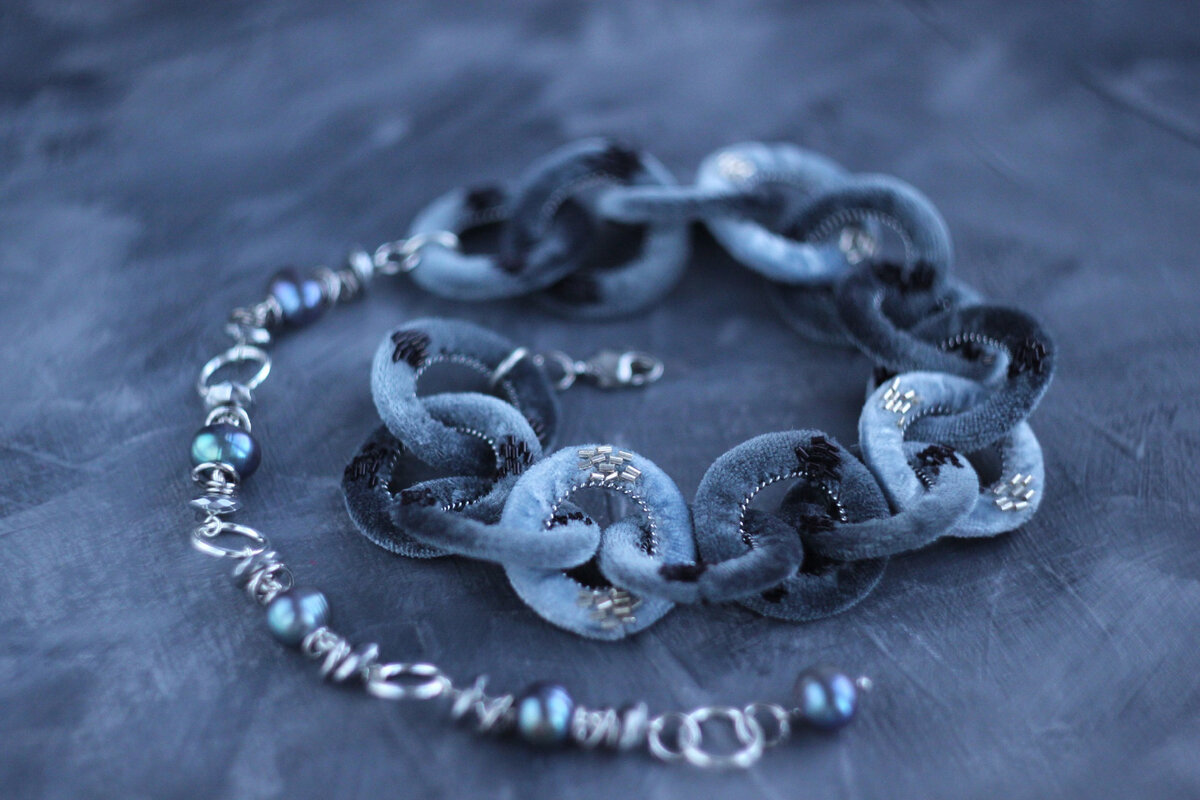 Я уже рассказывала вам в предыдущих статьях о том, с чего начинала работу с бархатом и по какому пути я потом пошла. Если кратко, я не рисковала - сперва это были изнанки брошей, позже небольшие бархатные вставки, а затем листья и целые цветы. Но мне хотелось выйти за рамки, сделать из бархата то, что с ним никак не ассоциируется, поиграть на контрастах. Бархат нежный материал, приятный наощупь, мягкий, тёплый, лёгкий. Что же поставить ему в противовес? Не помню, насколько долго я искала ответ, но как-то мне на глаза попались они! Крупные, тяжёлые, холодные цепи. Как было бы здорово, если бы звенья были легче, теплее и приятнее к телу, подумала я и сразу начала разработку. И да, бархатных цепей я ещё до этого не встречала, поэтому мне показалось это интересным. И я бросила вызов сама себе! Голову поломать пришлось в этот раз более старательно, чем обычно, мягко говоря. Провозилась, испортила несколько отрезков бархата, долго экспериментировала с обработкой самого материала, чтобы он б