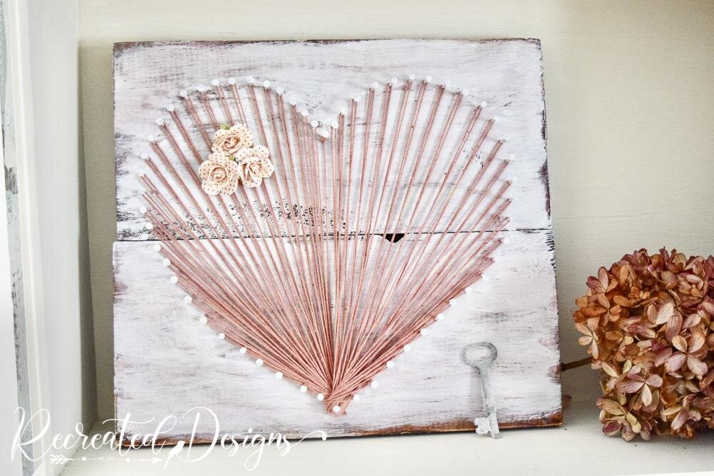 Каждый раз, возвращаясь вниз, закручиваем его вокруг одного и того же среднего гвоздя. Это создаст веерный рисунок. Такой же (аналогично) создаем на правой стороне сердца. Закончив плетение завязываем узел в нижней точке и запускаем кончик веревочки под струны. Несколько маленьких бумажных цветочков завершат композицию в винтажном стиле. Кстати, если в нижнюю грань основы вкрутить винт-крюки, получиться не просто панно, а еще и ключница. Вот так, всем спасибо за внимание!