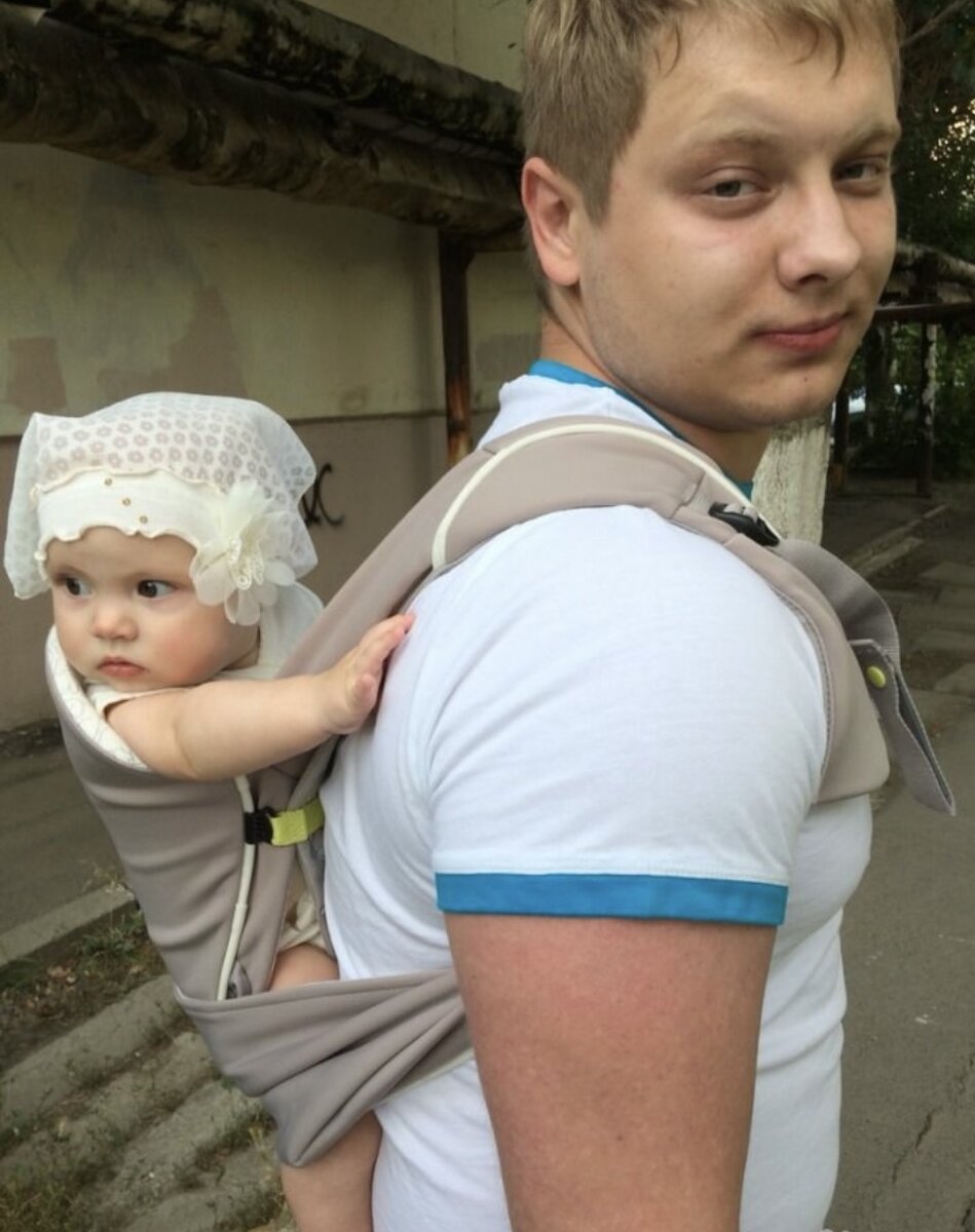 И ещё один совет: обязательно выбирайте хороший рюкзак, с поддержкой на пояснице и капюшоном, который поддерживает голову ребёнка во время сна. Этот капюшон можно использовать также для зашиты ребёнка от солнца, ветра или дождя. С первым ребёнком я покупала рюкзак фирмы Tiny love, но он нам не понравился, хотя в то время (6 лет назад) он стоил недёшево. Со второй дочкой я купила «Алоэ-слинг» и влюбилась. Помните, что в эргорюкзаке, в отличие от кенгуру, ребёнок может сидеть только лицом к маме. При этом можно располагать рюкзак и спереди на груди, и сзади на спине. Важна правильная М-позиция ножек. Если вы планируете использовать его подолгу, то обязательно в течение какого-то времени готовьте ребёнка к этому, периодически используя рюкзачок, чтобы он привык.