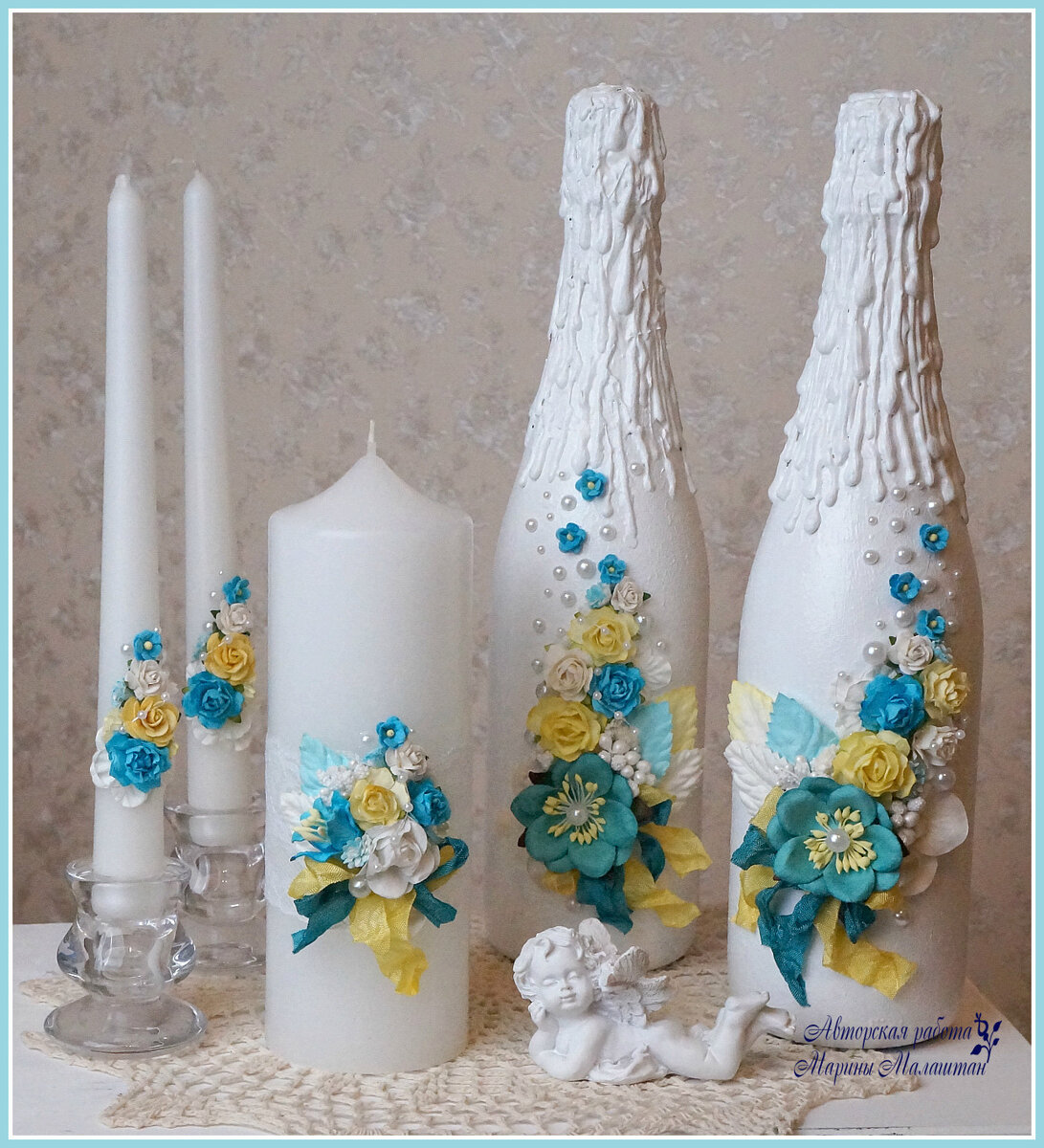 Лето - это пора свадеб. Сейчас так много всего в сфере #свадебной индустрии, что глаза разбегаются. Но как сделать свадьбу поистине запоминающейся, необычной? Как привнести в этот праздничный день "изюминку"? Один из вариантов - это свадебные аксессуары ручной работы. Когда праздник молодоженов украшает задекорированное свадебное шампанское, бокалы, подушечка для колец и многое другое, созданное именно для них, тогда это уникально, душевно и запомниться надолго. Когда всё в едином стиле, цвете и "играет" в унисон с праздничным оформлением - это красиво и стильно. За 9 лет работы мастером подарков ручной работы, декоратором, я создала множество комплектов свадебных аксессуаров ручной работы, пригласительных, свадебных открыток и альбомов. И сегодня я хочу поделиться с вами некоторыми из них. Этот набор был создан для будущих молодожен с учетом всех их пожеланий (цвет, стиль и пр.) Необычный акцент их праздника не остался не замеченным. Все гости по достоинству оценили #декор и шампанс