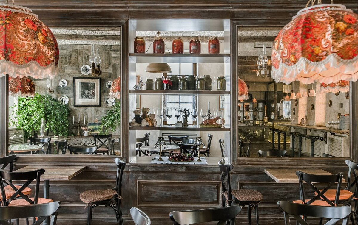 «Интерьер ресторана напоминает о богатейшем культурном наследии. Дизайнер Анна Муравина увидела цель в том , чтобы создать образ России, отразить русский дух, без опоры на конкретный исторический период, уйти от штампов «балалайки-матрешки» и показать богатейшую подлинную культуру страны. И все же матрешкам нашлось место: они стали частью светильников, изготовленных для этого ресторана российским мастером Олегом Гусевым. Он же создал необычную «открытую проводку», превращенную из технической необходимости в дизайнерские объекты».(цитата из журнала Архидом.)