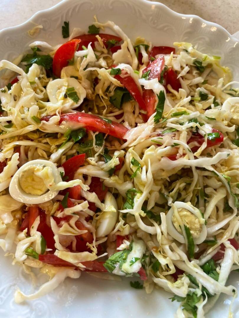 Ингредиенты: Капуста белокочанная молодая , Помидор, Яйца перепелиные, Соль и зелень , Оливковое масло