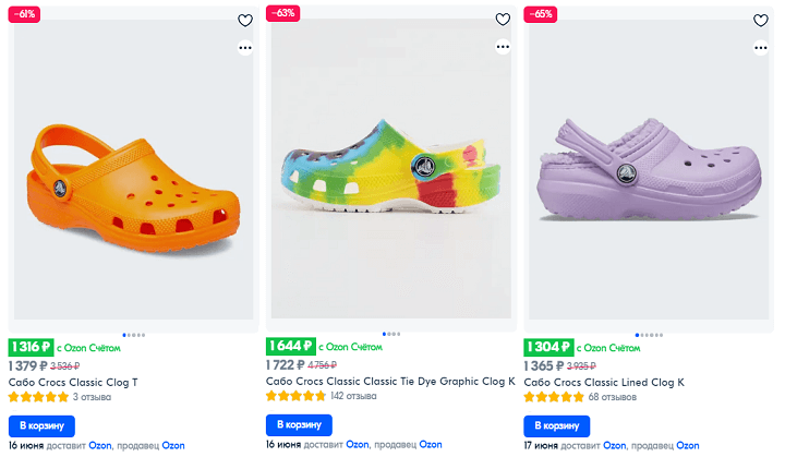 Представлены как женские и мужские, так и детские кроксы. При этом скидки действуют на все виды кроксов - сандалии, сабо, сапоги, кроссовки, дутики и т.д. Для получения максимальной скидки нужно активировать промокод NEWSPRING22. Также дополнительную 5% скидку вы получите при оплате OZON Счётом.