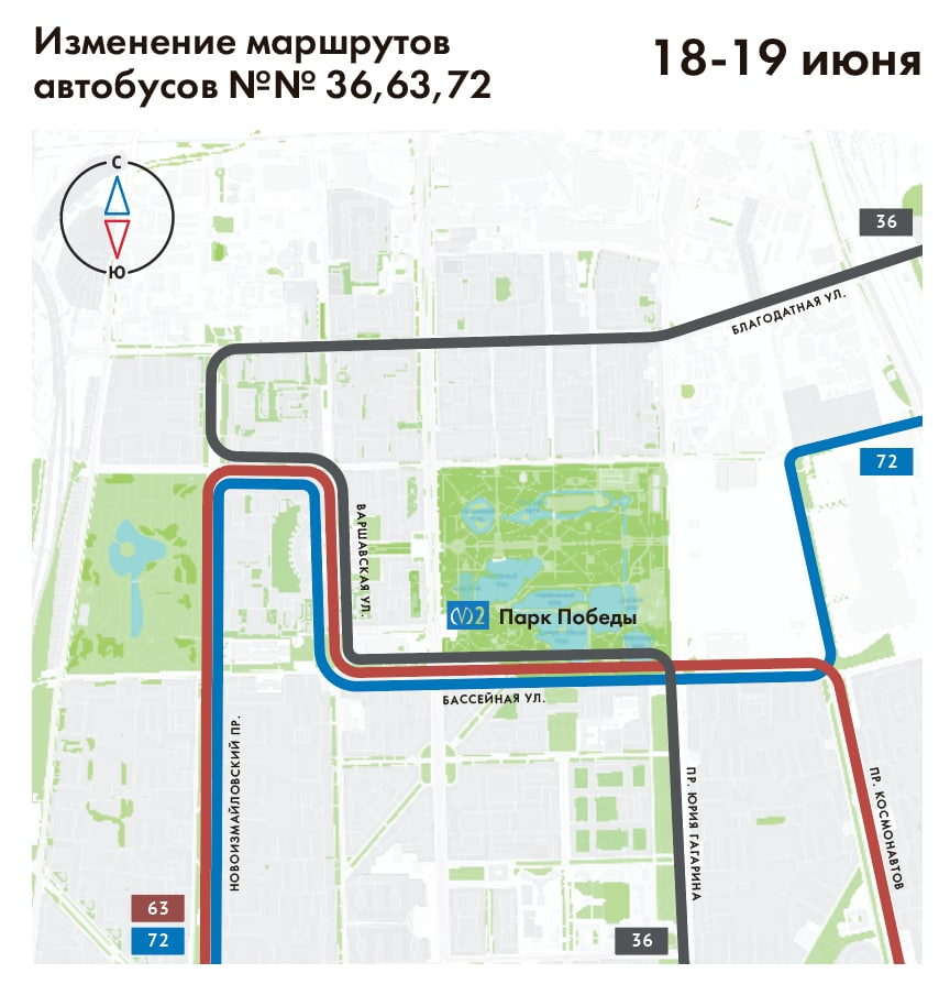 18 и 19 июня, в связи с дорожными работами на Бассейной ул. Вносятся изменения в трассы автобусов №№ 36, 63, 72. Транспорт направлен: Автобус №36: от конечной остановки «Московское шоссе, 35» по действующей трассе до Бассейной ул., далее по Варшавской ул., Кузнецовской ул., Новоизмайловскому пр. и далее по действующей трассе до конечной остановки «улица Самойловой» (В оба направления); Автобус № 63: от конечной остановки «улица Костюшко» по действующей трассе до Новоизмайловского пр., далее по Кузнецовской ул., Варшавской ул., Бассейной ул. и далее по действующей трассе до конечной остановки «метро «Купчино» (В оба направления); Автобус № 72: от конечной остановки «Звездная улица» по действующей трассе до Бассейной ул., далее по Варшавской ул., Кузнецовской ул., Новоизмайловскому пр. и далее по действующей трассе до конечной остановки «Метро «Кировский завод» (В оба направления).