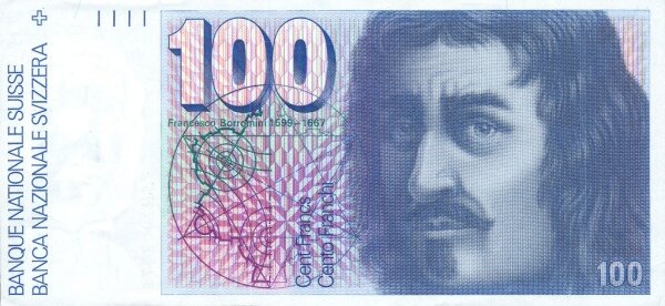 Первой была выпущена осенью 1976 года купюра в 100 франков. Она была посвящена творчеству великого итальянского архитектора XVII века Франческо Борромини (он был уроженцем Тичино). На лицевой стороне – его портрет. На обороте – одно из самых известных его творений, шедевр барокко, церковь Сант Иво алла Сапьенца в Риме (на лицевой стороне дан фрагмент её чертежа).