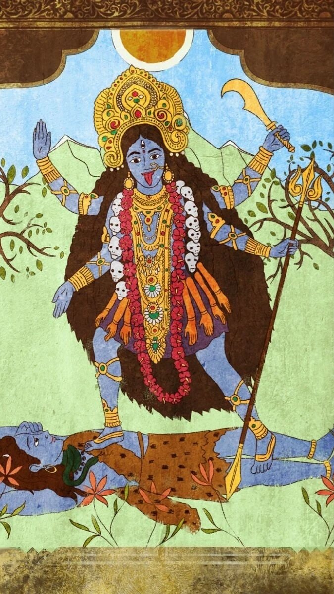 РАСШИФРОВКА ИКОНОГРАФИЧЕСКОГО ОБРАЗА ДАКШИНАКАЛИ Одним из наиболее распространенных культов Великой Богини является культ Дакшинакали – грозной Богини, наделяющей дарами и принимающей дары. Дакшинакали четырехрука и трехглаза. Она стоит на покоящемся Шиве. Ладонь одной из Её рук сложена в абхайа мудре (мудре бесстрашия), что символизирует защиту адептов. Ладонь другой Её руки сложена в варада мудре (мудре даяния), что символизирует наделение адептов необходимыми для них дарами. Природа Дакшинакали такова, что Она устрашила даже Яму – Бога мертвых, чье царство находится на юге, направлении света, именуемом на санскрите «дакшина». Черный цвет Кали символизирует превосхождение Ею всех форм и дихотомий, пустоту и полноту одновременно. Черный цвет выражает и полноту, так как в него поглощены все существующие цвета (вишвагуна), а также полное отсутствие какого-либо цвета или качества (ниргуна). Кали имеет неописуемую природу Бхайравы, которая подобна черноте небытия. Однако при этом, Она