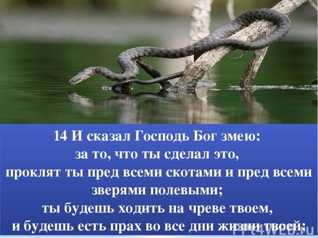 После вкушения запретного плода с дерева познания добра и зла, а следовательно и после грехопадения человека, Господь изрек заслуженное наказание, прежде всего змею, который стал орудием искушения. Он был проклят перед всеми животными и ему была предрешена жизнь пресмыкания на чреве своем и питания прахом земли. Предыдущую статью читайте по ссылке: https://zen.yandex.ru/media/id/62316a021f52de7c1bcc7e6b/6274dbe4063dbb11d28e586e Что Библия называет смертью. Ева и змей-искуситель. Святые отцы однозначно воспринимали повествование об искушении змеем Евы и о грехопадении, как описание действительного события, а не как загадочный миф. Само Св. Писание не дает никакого основания считать историю грехопадения иносказанием. Змей не был образом, в котором явился сатана. Демоны и диавол действительно могут являться в разных образах . Змей был реальным животным, а не только иллюзией его. А с другой стороны, говорил и действовал, конечно, не змей, а сатана через него. Сатана использовал змея, как