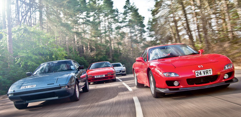 Начало легенды, именно с модели RX-7 началось реальное роторное доминирование Mazda. Мотор 12A на 105 л. с. а потом случился рестайлинг и мотор приобрёл турбонаддув и выжал 165 л. с. Дизайнером же стал Матасабуро Маеда, а сын Икуо дал дизайн RX-8. Не только дизайнер сделал красивый вид, инженеры смогли сделать этот вид очень лёгким, машина весила 1100 кг, на это так же сыграл ротор, вес всех моторов еле превышает 100 кг и колеблется в районе 110-120 кг, при этом сам мотор был смещён ближе к центру автомобиля, что дало больше среднемоторную компоновку хоть и называют её переднемоторной. При этом FB также обладала совершенной повеской 4-звенной независимой задней подвески. До сотни FB долетала за 9,7 с. По итогу продали их в количестве 474565 штук.