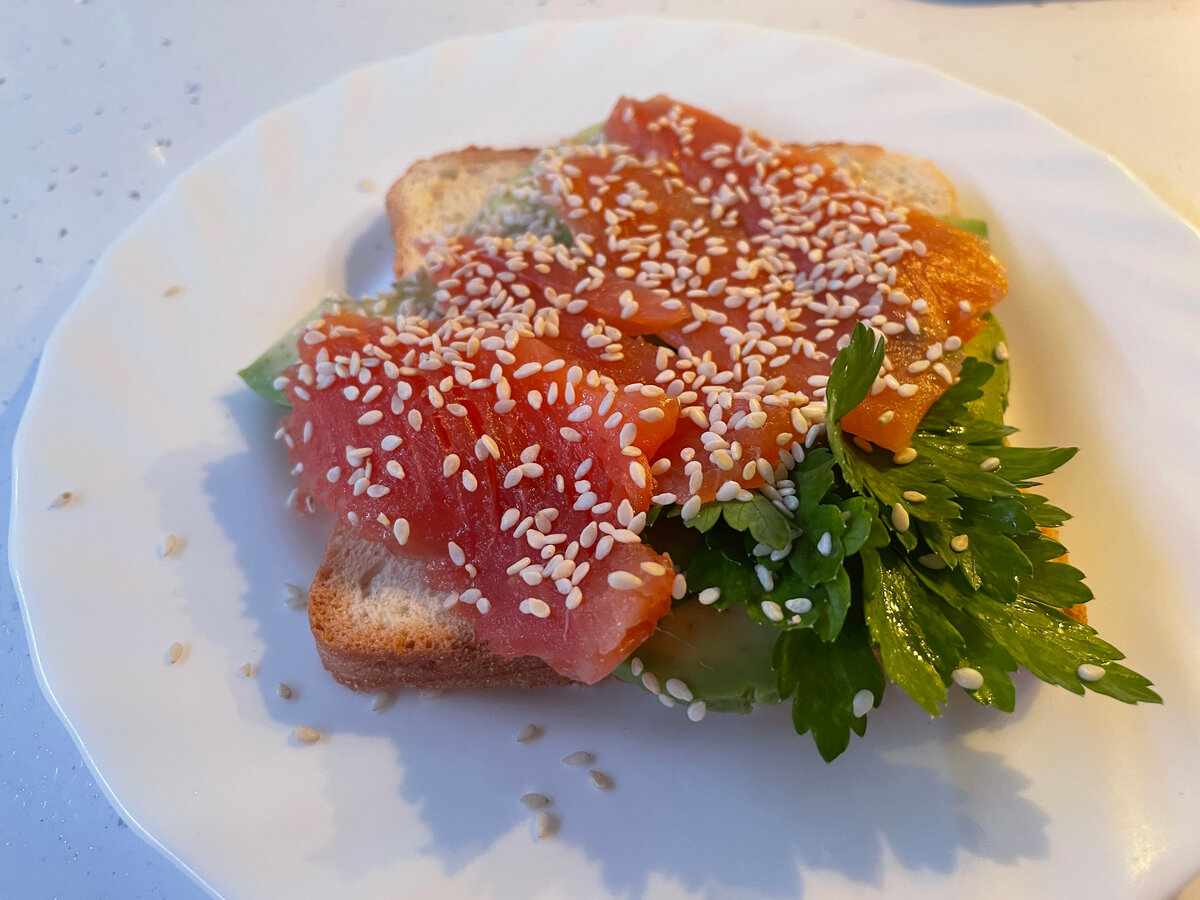 На завтрак поджаренный хлеб с форелью авокадо прекрасное начало дня. Необходимые ингредиенты: 1 Этап 1. Хлеб обжариваем на сковороде с двух сторон (у меня сковорода гриль) 2. Авокадо разрезаем пополам 3. Одну половинку очищаем от кожуры и нарежаем тонкими пластинками 2 этап 1. Нарезанное авокадо выкладываем на поджаренный тост 2. Поверх авокадо выкладываем ломтики малосольной форели 3. Украшаем кунжутом и зеленью петрушки Бутерброд готов, приятного аппетита! Время приготовления 15 минут. Примерная стоимость данного блюда составляет - 150 рублей. Состав на 100 грамм: