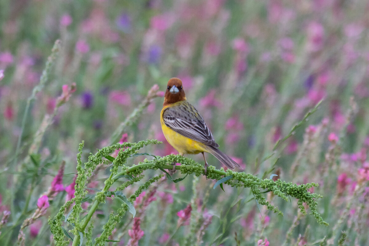 Яркая птица, которая встретилась нам одной из первых, причем случайно, во время остановки на небольшой ремонт машины. Многие овсянки похожи по экологии, и эта, так же, как и наша обыкновенная овсянка, населяет мозаичные полуоткрытые ландшафты: луга, поросшие кустарником, опушки и т.д. Самец (на фото) очень яркий, самка невзрачная. В России желчную овсянку можно встретить в северном Прикаспии (западная граница ареала), а также на самом юге Алтая.
