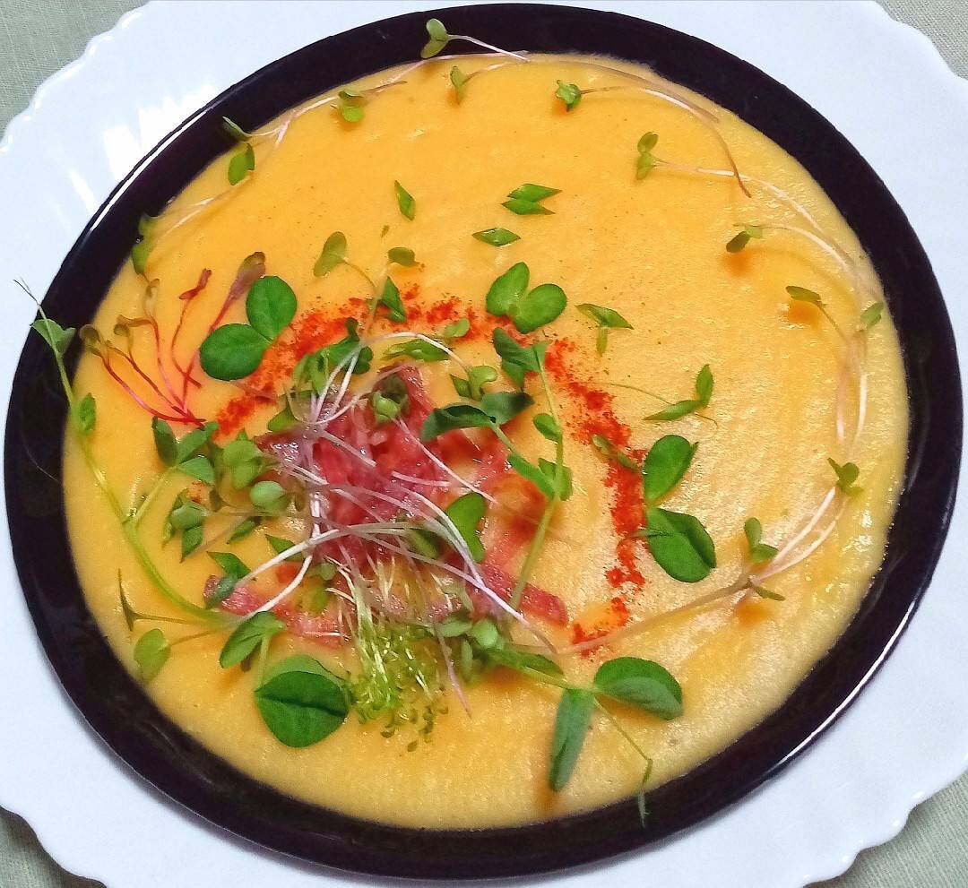 Гороховый суп один из моих любимых, а мои домочадцы и смотреть на него не стали бы. Решила пойти на хитрость, измельчить всё блендером. Лопали за обе щёки и даже не спросили из чего суп.😋😄 #летнееменю #готовимвместе #хочуразбор #гороховыйсуппюре Ингредиенты: воды, сухого гороха, морковь, луковица, картофелин, у меня молодой, сливочного масла или растительного, соль и копчёная паприка, Для подачи, зеленый лук, микрозелень, колбаса с/к или п/к Способ приготовления: Горох промыть до прозрачной воды, залить холодной водой на 1 час, можно оставить на ночь. Опустить набухший горох в кастрюлю с кипящей водой, варить до готовности ~ 1 час, снимая пенку и периодически помешивать, чтобы не пригорело. Крышкой советую не накрывать, так как при варке гороха образуется много пены и суп "убежит". Молодой картофель очистить от шкурки, очень легко её снять губкой для мытья посуды, нарезать дольками, опустить в кастрюлю к гороху через 30 минут, как начал вариться горох. Лук и морковь нарезать крупно и