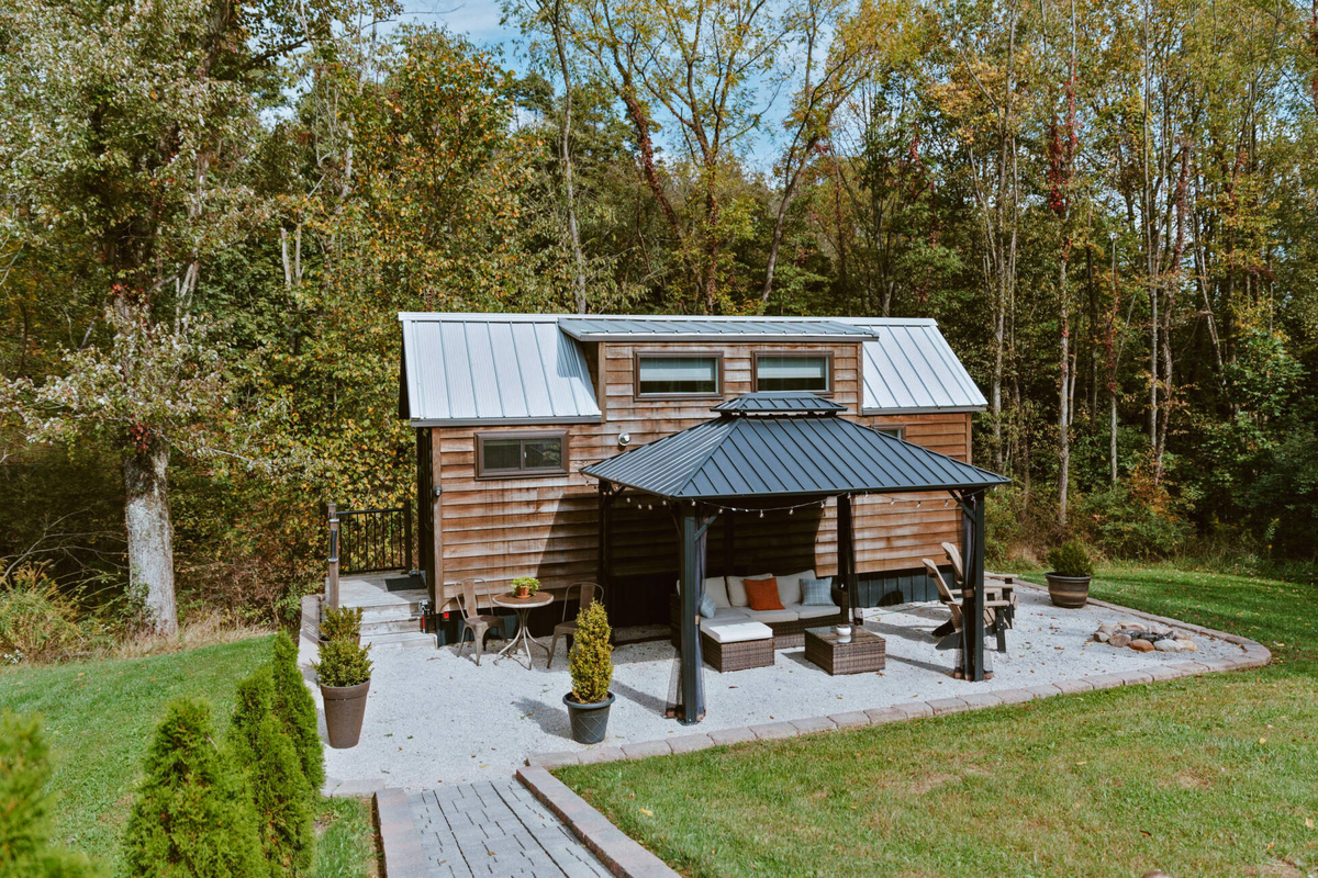 Каркасный микро-дом на окраине леса: деревянная отделка, эргономичная планировка, большая зона отдыха