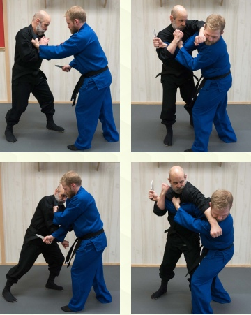 Нападение с ножом ужасно, жестоко и часто происходит быстро. Традиционные техники ниндзя должны быть тонкими до такой степени, что они будут восприниматься как невидимые для разума нападающего, но при этом создают эффективную защиту и быстрый путь к побегу. Слияние техник ниндзя с реальностью современных ножевых атак - непростая задача. Есть несколько важных основ, которые нужно понять в первую очередь в схватке против ножа: управляйте рукой, займите более безопасное положение, нарушайте равновесие во время движения, эффективное используйте удары, болевые и их связки для завершения боя. После обучения ниндзя может сосредоточиться на том, чем они лучше всего известны - быть невидимыми. Один из способов создать «невидимую» защиту ниндзя — это органично вписаться в происходящее, позволить атаке продолжаться по намеченной траектории с достаточным сопротивлением и движением, чтобы оставаться в безопасности. Затем, когда кажется, что атака должна сработать, появляется защита, обращая энергию