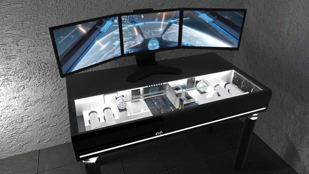 ПК в столе- достаточно интересное решение, которое будет бросаться в глаза всем людям пришедшим к вам в гости(если комплектующие под стеклом) Стоит ли того Многие компании делают пк в столе, зная что их будут покупать. И цены достаточно не скромные. От 200000 до 2000000 Для кого Однозначного ответа нет. Но в основном их покупают для офисов, пантов или для тех, кому нужен компьютер высокой производительности с красивым внешним видом — без громоздкого системного блока. Почему такие цены Многие жалуются на их цены, но некоторые не понимают как трудно, засунуть компьютерные комплектующие, в относительно небольшой стол Главная фишка, это конечно полное отсутствие кабелей (он всего один) и никаких больше системных блоков под ногами. Даже зная про цену таких решений люди их всё равно покупает Если вам понравится эта статья то я напишу про то как сделать такое решение. Извиняюсь за долгое отсутствие статей, не было возможности их писать.