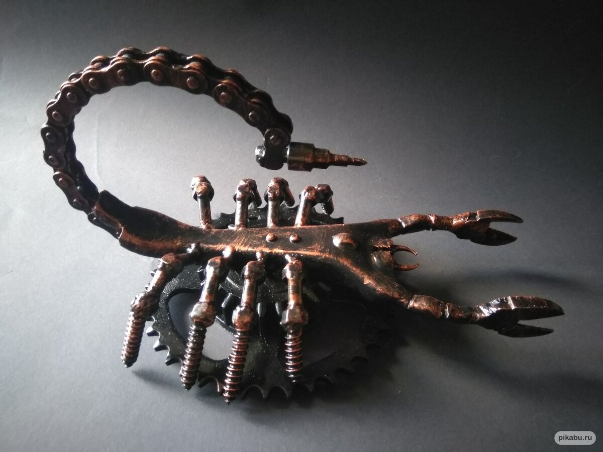 Бронзовый бойцовый мех-скорпион Малюта Скуратов. Быстрый и опытный боец крепкого сложения (бериллиевая бронза - это, знаете ли, не какая-то там сталь 3!). 29 побед на ринге (из них шесть - ударом жала и три по очкам). Может быть отличным защитником дома\квартиры, коррозии не подвержен, в быту абсолютно неприхотлив. Материалы - выжимная вилка сцепления, мотоциклетная цепь, лапы - анкера, клешни - бокорезы. Жало - сверло для конфирматов.