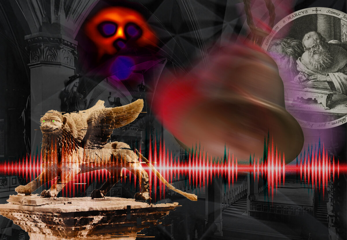 Крылатый лев в христианстве, как известно, является символом Святого Марка — одного из четверых евангелистов. Поэтому человек с трубой — это сам Святой Марк. Это очень необычное изображение, ведь в современной традиции Святой Марк изображается не с трубой, а с книгой или свитком и пером.