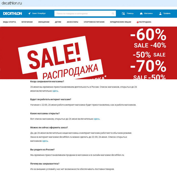 Совсем скоро закроются в России магазины компании "Декатлон", на сайте появилась точная дата - 26 июня 2022 года. Компания еще весной объявила о постепенном закрытии, продержались несколько месяцев, но больше так работать нельзя: огромного количества ассортимента просто нет в наличии, запасы остального подходят к концу.