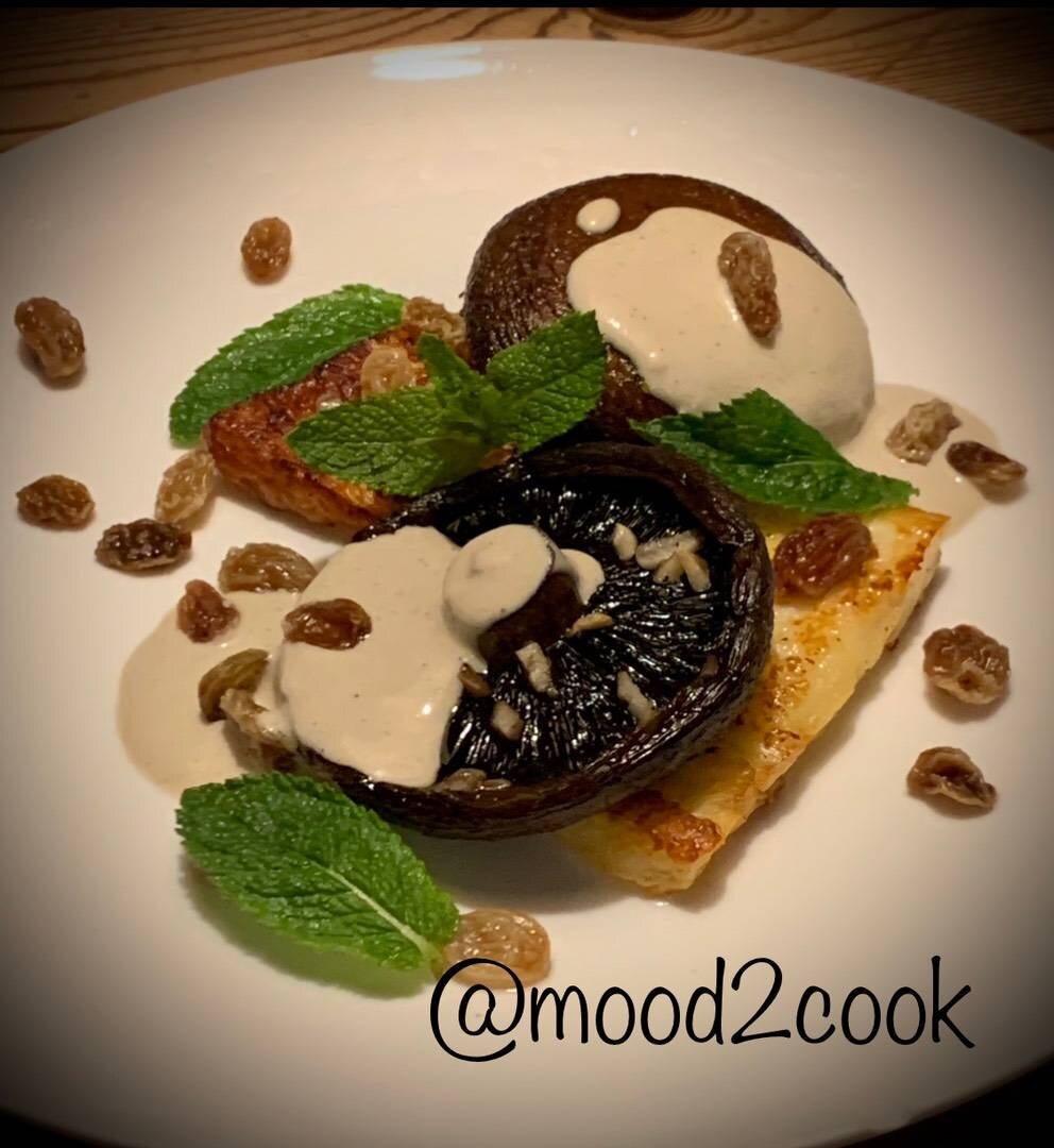 Простая и очень вкусная закуска- стартер в духе ближнего востока! Кстати, крупные шампиньоны так же прекрасно подойдут для этого рецепта! #пп Ингредиенты: Портобелло, Чеснок, Сыр халуми, Изюм светлый, Паста тахини (тхина), Лимон, Оливковое масло, Соль, перец , Свежей мяты Способ приготовления: Мелко нарубите чеснок и смешайте с оливковым маслом и специями. Натрите этим маслом предварительно очищенные грибы. Запеките в разогретой до 200 градусов духовке около 10 мин. Сыр нарежьте кусочками и обжарьте на разогретом масле до золотистой корочки. Изюм залейте кипятком и оставьте разбухать минут на 10. Тхину смешайте с лимонным соком и добавьте специи. Добавьте немного кипячёной воды и размешайте до густого, но текучего однородного соуса. Выложите на тарелки сыр и гр бы, полейте соусом и посыпьте изюмом. Украсьте закуску листиками мяты. Приятного аппетита.