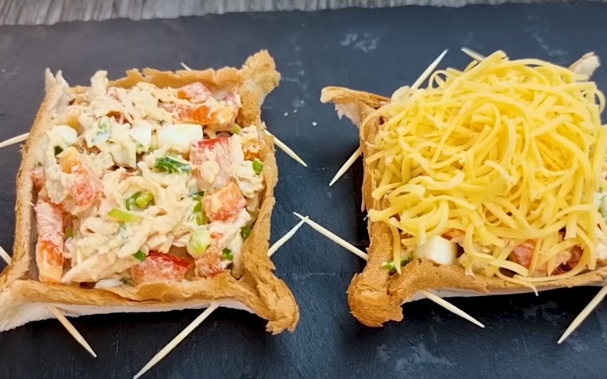 Этот новый рецепт тостов понравится всей семье. Рецепт: 1/3 части небольшого перца Перья зеленого лука 1/2 части вареной куриной грудки 1 вареное яйцо 1/2 столовой ложки сметаны или белого йогурта или кефир 1/2 столовой ложки соуса для бургеров тост делай то, что я показываю Используйте деревянные зубочистки Сыр Выпекать на верхней решетке 5 минут при 200 ° C или пока сыр не растает. Вкусный и хрустящий завтрак готов! Приятного аппетита!