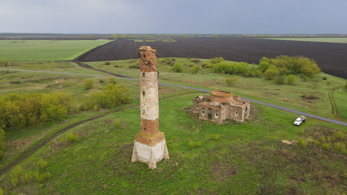 В 1796 году в деревне Ивановка Липецкого уезда Тамбовской губернии была построена церковь с «курьезнейшей», по мнению историка архитектуры А.Н. Бенуа, колокольней. Колокольню спроектировал Николай Александрович Львов - близкий друг владельца имения Петра Лукича Вельяминова. Строительством руководил Томазо Адамини. Колокольня, как и церковь, носит имя Иоанна Предтечи и напоминает мусульманский минарет или маяк. Конечно, первым делом мне захотелось подняться на верх колокольни. Как же хорошо, что залаз оказался очень узким - нижние ступеньки развалились. Когда мы подняли коптер и подлетели к колокольне, то увидели там... лису! К сожалению, на фотографиях её очень сложно разглядеть, потому что она сливается с колокольней. Лиса, услышав непонятный звук, поспешила скрыться вниз по лестнице. Позже мы ещё раз подлетели, чтобы увидеть её, но она так и не показалась нам. На первой фотографии видны черные ушки и мордочка около деревянной балки, а на второй - лиса уже на лестнице вдоль стены. Це