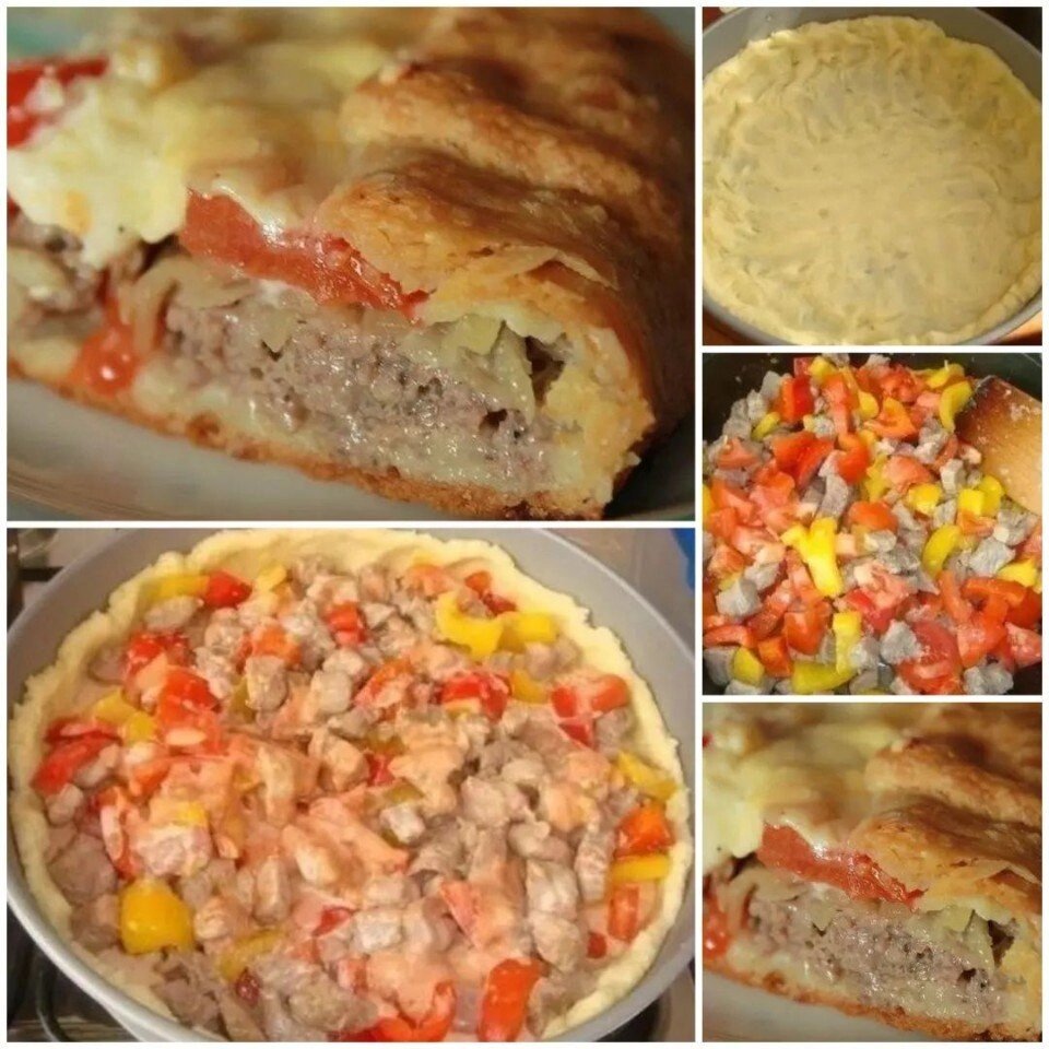 "Изюминка" этого рецепта в наличии картофельного пюре в тесте. Хорош и горячий, и холодный! Очень сочный и вкусный! Для теста: 200 гр. картофеля,200гр. муки,1 яйцо,50гр. сливочного масла, соль. Для начинки: мясо 500 гр, 2 болгарских перца, 1 помидор, 2 небольшие луковицы,, 100 мл. жирных сливок (33-38%), 100 мл. молока, 2 небольших яйца (в заливку), 2 ст.л. томатной пасты, соль, перец, немного тертого сыра. Приготовление: Картофель мелко нарезать и отварить в подсоленной воде до готовности. Затем воду слить, картофель размять. Добавить яйцо, масло, хорошенько перемешать. Всыпать муку и замесить тесто. Выкладываем его в разъемную форму, делая бортики отправляем в морозилку пока готовится начинка. Перец нарезаем не крупно, слегка обжариваем. Лук измельчаем, обжариваем на отдельной сковороде, добавляем мясо, нарезанное мелкими кубиками, обжариваем почти до готовности, солим. Добавляем перец и мелко нарезанный помидор, выкладываем начинку на тесто. смешиваем сливки, молоко и томатную пас