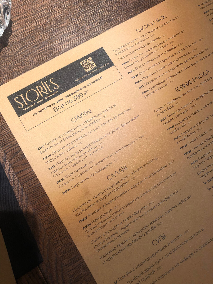 Огромное количество ресторанов вводит туристов в тупик. Куда пойти, чтобы точно было вкусно и красиво? Сегодня я расскажу про ресторан Stories. Недавно заведение полностью изменило свою концепцию. Все позиции за 399 рублей✌️ Я давно слышала хорошие отзывы об этом месте. И вот мне удалось тут побывать. 📌Меню Не очень много позиций. Есть пасты, морепродукты, салаты, стартеры, пицца и полноценные вторые блюда. 📌Что пробовали Не очень понравилось. Сыры как будто сильно запеклись. Но пиццы вкусная и большая Вкусно и сытно. Понравилось. Чувствуется, что бифштекс был сделан на огне! Очень вкусно. Мягкий багет и прекрасный соус 10/10. Вкусный травяной чай + мёд и варенье. ✨Итог Приятная атмосфера, неплохое меню и вкусная еда Приезжайте в Калининград и попробуйте сами💙