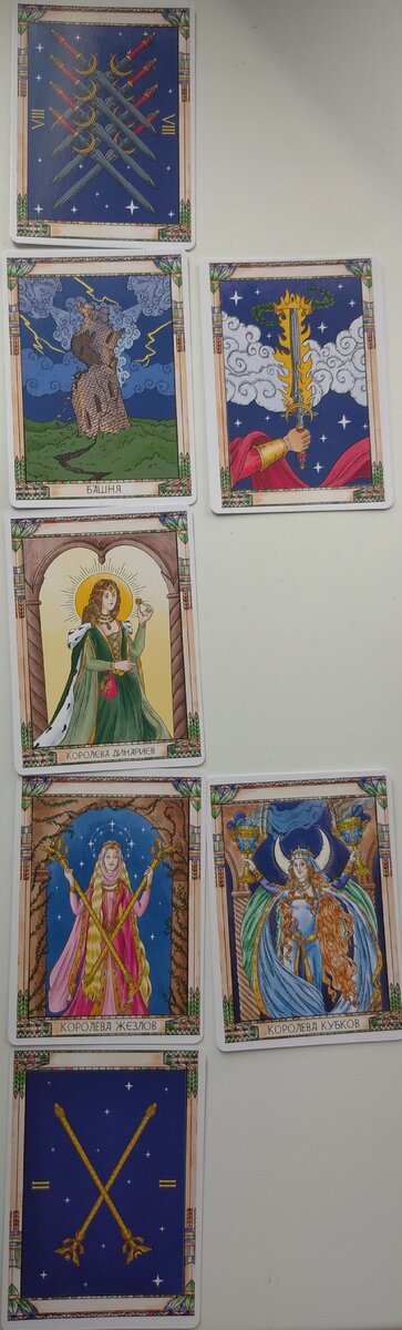 Ситуация на сегодняшний день. ПРЕПЯТСТВИЯ. Что мешает. Несчастливая карта, обозначающая крушение планов и надежд, будь то разрыв отношений или внезапная травма либо болезнь. Вас ждут резкие перемены, конец привычной жизни, прекрасная возможность использовать этот момент для самосовершенствования. В перевёрнутом виде означает длительные переживания. В любовном раскладе- серьёзные конфликты, неверность. Что может помочь. ТРИУМФ.(Выдающийся, блестящий успех, победа; торжество.) К чему может привести. ИЗОБИЛИЮ. (Изобилие — это большое количество, обилие, множество, излишество, достаток, довольство, богатство чего-либо.) Что делать, чтобы достичь цели. ДРУГ.( попросить помощи совета и тому подобное.) Чего не следует делать. ИНТУИЦИЯ.(значит не следует слушать свою интуицию.) Чем всё закончится. Состояние ПЕЧАЛЬ.