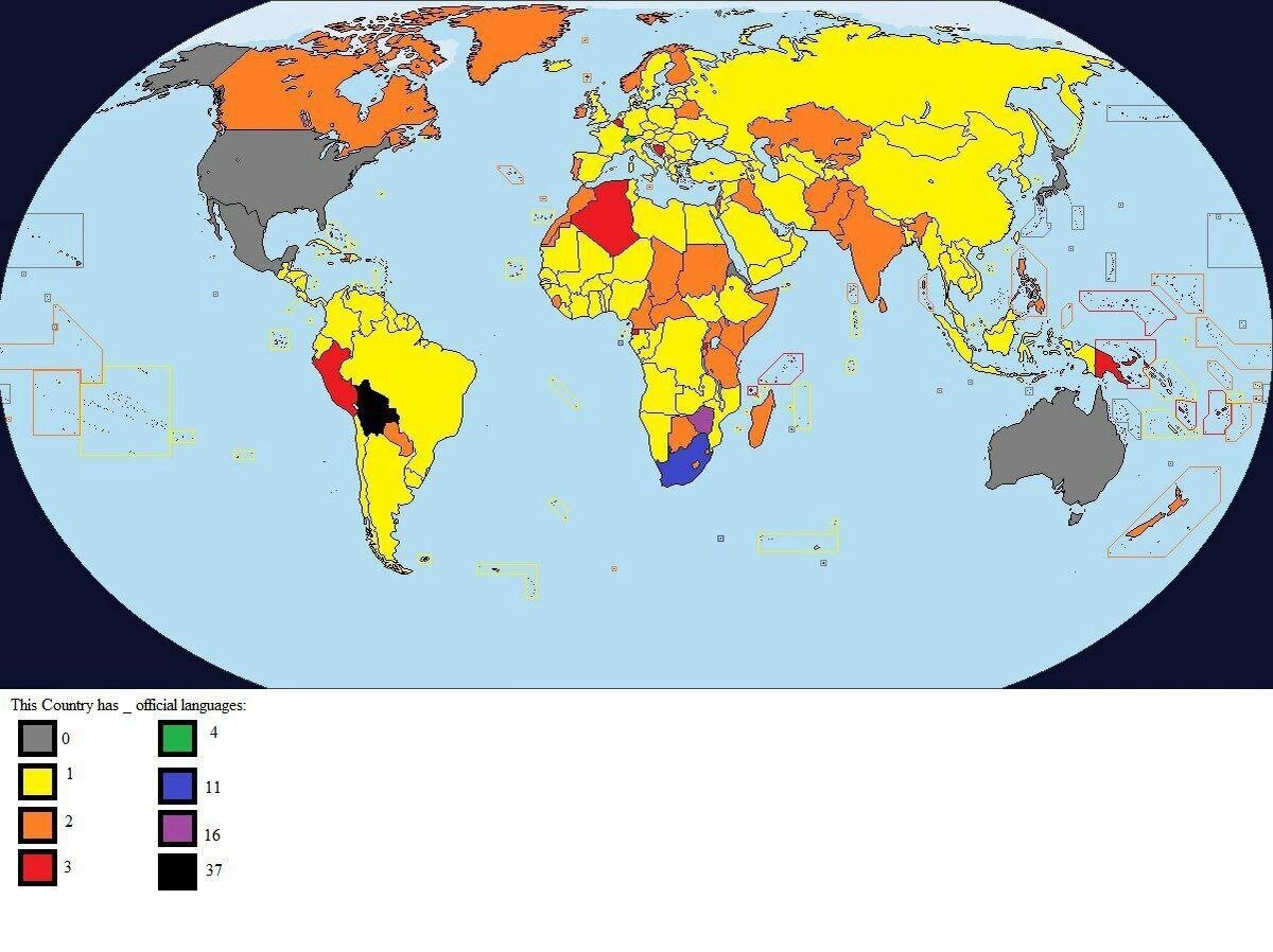 Количество официальных языков в странах мира. В США такого понятия в принципе не существует, швейцарцы - рекордсмены в Европе (целых 4 наречия), а в общем тон задает Боливия с ее 37 языками.