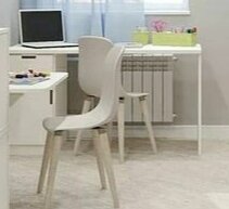 This room has blue and white walls, two white tables, 2 old chairs, colored markers on the table, 2 bookshelves, colored books, a gray sofa,a white bed, a gray white and green carpet, paintings, one window, colored pillows, a white box, a computer, white lamps, photographs, this nice room