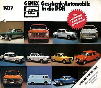 Автомобили из Восточной Европы. Само собой разумеется, автомобили из Восточной Европы, такие как Dacia, Škoda, Polski Fiat или Lada, также были доступны и считались более удачными автомобилями в ГДР. Западный автопром Более дорогие варианты были представлены западными брендами: можно было подарить родственнику автомобили западноевропейских автомобильных корпораций VW, Peugot или Fiat. Наиболее часто заказываемой моделью из всех западных был VW Golf. Бренды Yamaha, Mazda, BMW, Lancia и