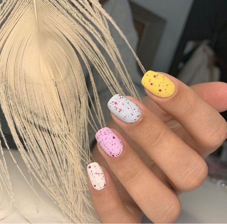 Маникюр с покрытием гель-лак, данная работа выполнена в пяти разных оттенках: красный, желтый, голубой, розовый, белый! Покрытие матовое с розовыми блестками! Выглядит очень эффектно и необычно! Приглашаем к нам в студию на маникюр, педикюр, а так же наращивание и ламинирование ресничек!