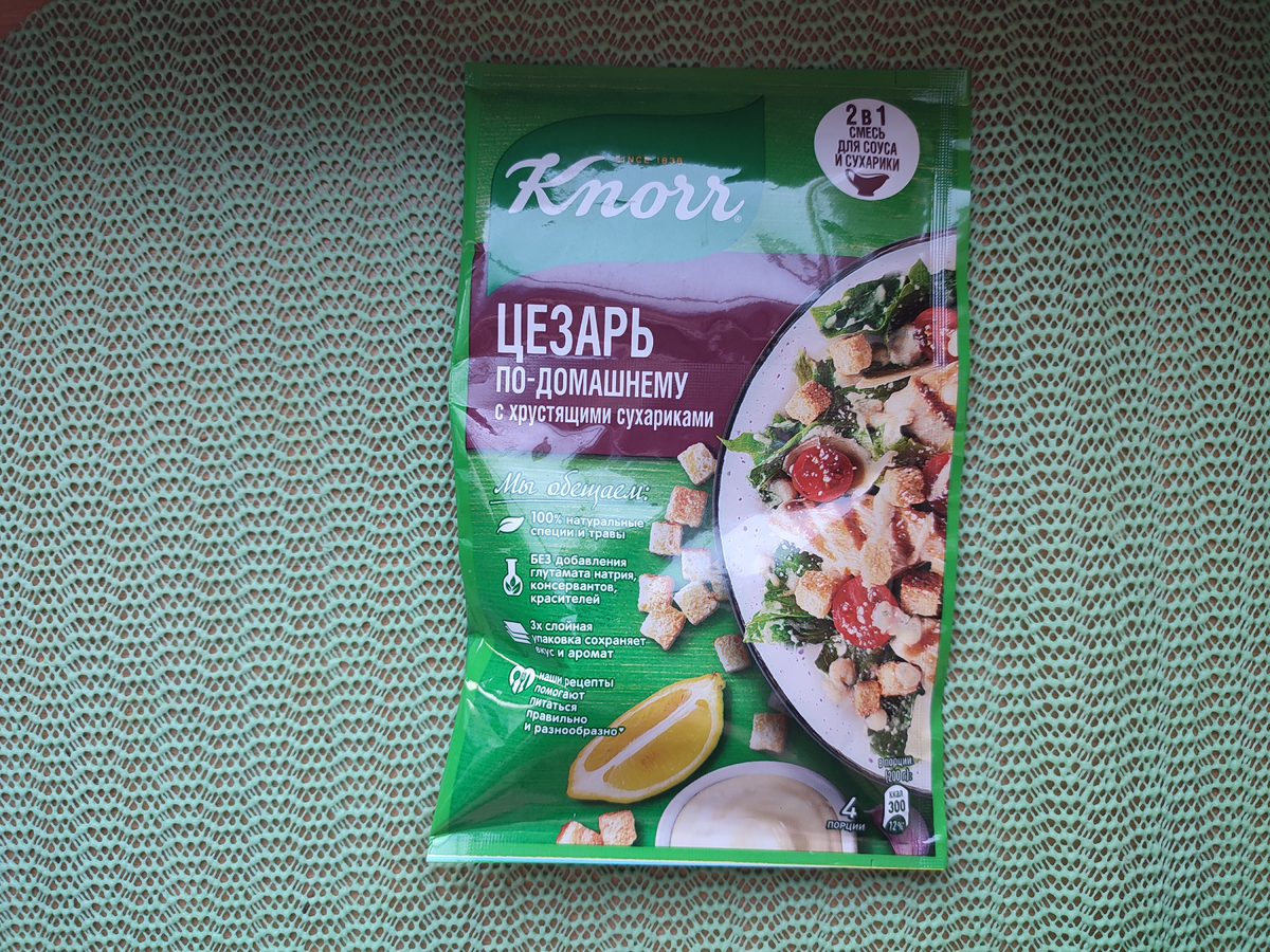 Привет! Сегодня решила приготовить дома салат "Цезарь", с приправой от Knorr. Результатом осталась довольна, поэтому спешу поделиться с вами. Мне в таких приправах нравится то, что есть понятная инструкция и указано точное количество ингредиентов. Филе курицы ( 400 гр) я нарезала и обжарила до готовности на растительном масле, посолив по вкусу. Овощи вымыла и оставила сушиться на полотенце. Листья салата ( 250 гр) рву руками на средние кусочки. Помидоры черри ( на 1 порцию ушло примерно 6 шт) нарезаю пополам и укладываю на листья салата. Огурец нарезаю полукольцами ( на 1 порцию ушло примерно по половине) Для смешиваю приправу из верхнего отсека и майонез ( 4 ст.л.) На овощи выкладываю обжаренную курочку. Соус и сухарики ( они находятся в нижнем отсеке) добавляю непосредственно перед подачей. Салат вышел очень вкусным и сочным. Со своей стороны я внесла корректировки: не стала добавлять сок лимона и сыр, так мне нравится больше. Прошу, поддержите меня своим лайком и подписк