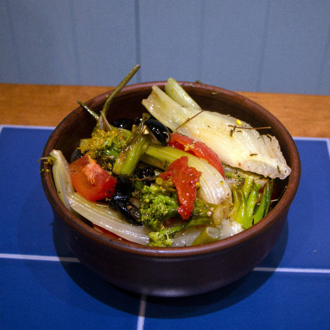 Ингредиенты: Фенхель, Брокколи, Чеснок, Томаты, Оливки, Белое вино, Черный перец , Соль , Оливковое масло, Тимьян, Розмарин