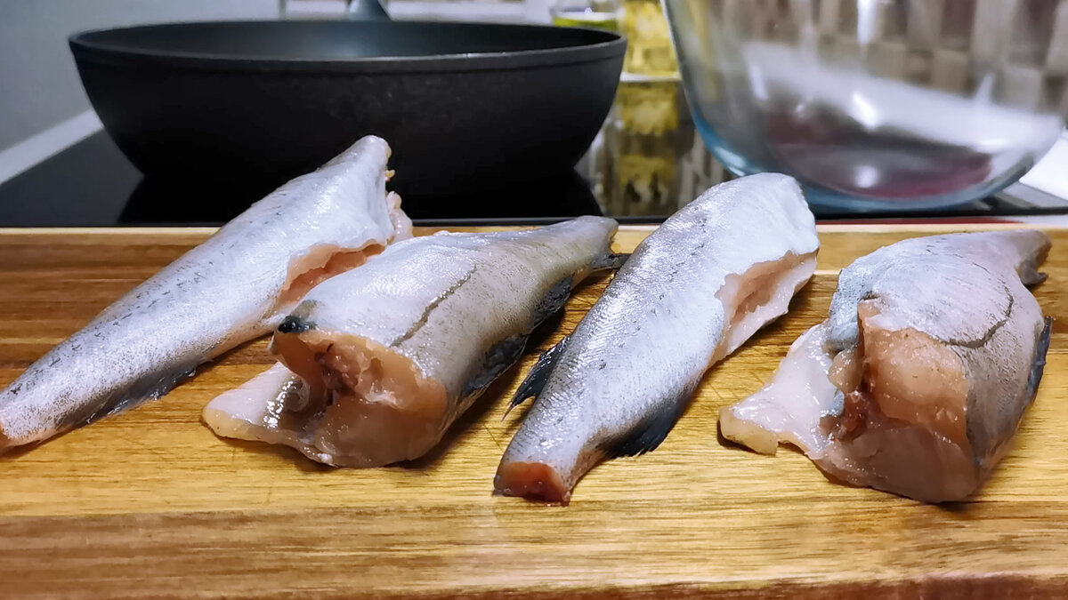 Из недорогой рыбы чаще всего покупаем минтай. Готовим его в разных соусах - и в красных томатных, и в белых сметанных. Такие рыбные блюда подходят под любой гарнир. Рыба получается очень вкусная и готовится просто. Самое наше любимое и нежное блюдо - это в сметане с овощами. Все ингредиенты и их количество есть в конце статьи. Как мы готовим: Минтай чистим, моем и разрезаем каждую рыбину на 3-4 части. Солим, перчим по вкусу, складываем в миску, поливаем соком лимона и все хорошо перемешиваем. По поводу чистки рыбы. Мы специально не срезаем плавники. Так проще из готовой рыбы вынимать мелкие плавниковые косточки. Потянули за плавник и вытащили. А если срезать сразу, то косточки постоянно на зуб потом попадают. Но это уже кому как нравится. Можно и срезать. Дальше обваливаем кусочки в муке. Чем щедрее слой муки, тем вкуснее. Обжариваем рыбу на растительном масле по 2-3 минуты с каждой стороны до румяности. Огонь должен быть сильным. Убираем рыбу со сковороды и прямо в ней же обжариваем