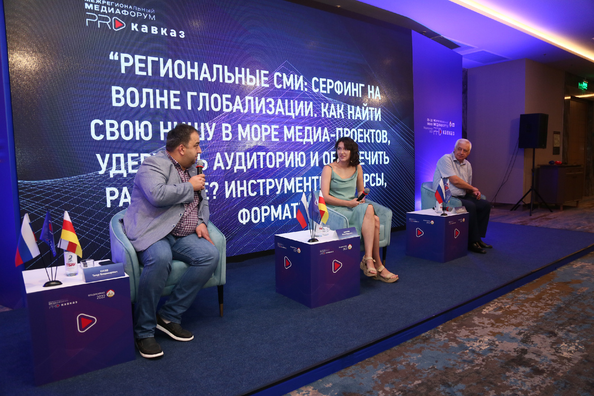 Дискуссия на тему «Региональные СМИ: серфинг на волне глобализации. Как найти свою нишу в море медиапроектов, удержать аудиторию и обеспечить развитие? Инструменты, ресурсы, форматы» собрала коллег из периодических изданий Северного Кавказа. Экспертами на площадке выступили Тимур Кусов, председатель СЖ РСО-А, директор филиала ВГТРК «ГТРК «Алания», Юрий Фидаров, председатель Компечати РСО-Алания и медиаисследователь Юлия Загитова.