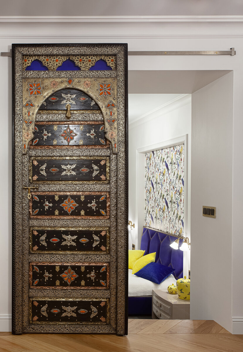 Интерьеры в марокканском стиле выделяются своей экзотичностью и особым восточным характером. И это не означает, что все полы и стены должны быть завешаны коврами, а дверные проёмы оформлены в виде резных арок — современные проекты отнюдь не выглядят аляповатыми и устаревшими. Дизайнер Мария Устинова рассказала, какие выразительные элементы Марокко можно включить в интерьер, чтобы не перегрузить его. 7. Марокканская дверь Резная дверь в марокканском стиле сильно повлияет на восприятие интерьера. Поскольку стилистически это довольно тяжеловесный объект, лучше устанавливать его в просторных помещениях желательно с высокими потолками. Особенно это касается изделий со сложносочинённым дизайном — металлическими элементами и инкрустацией камнями. Чтобы визуально облегчить интерьер, лучше выбрать дверь амбарного типа, которая будет отъезжать в сторону. 6. Зеркала Ненавязчиво добавить этнические детали Марокко в интерьер помогут зеркала. Лучше всего подойдут модели в резных металлических и