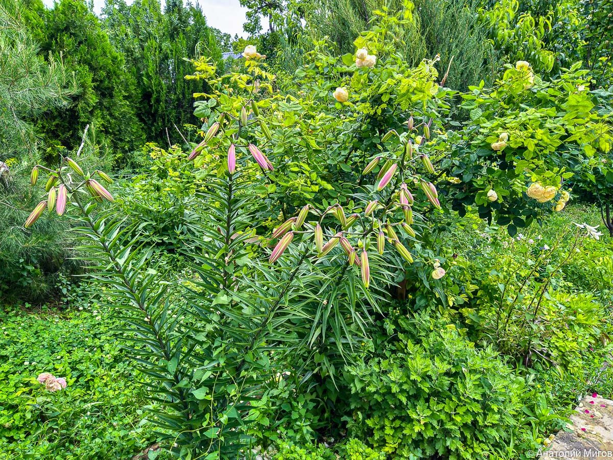 Самые роскошные лилии в нашем саду - ОТ-гибриды. Посадили их три года назад. Прошлым летом цветы на них были размером чуть ли не с человеческую голову. А в этом году лилии ещё вверх вытянулись, так что меня переросли и бутонов намного больше. В общем, пока не начали цвести, надо лилии выручать. Хотя стволы у них толстые и прочные, но под тяжестью цветов могут сломаться. Отправился на хоздвор в поисках подходящих крепёжных материалов. Тут у меня старые доски, бревна и кое-какой металл. На переднем плане металлическая арка, на которой рос виноград Изабелла. Я эту старую конструкцию демонтировал и отнёс на хоздвор. Вот и пригодилось. Взял болгарку и порезал эту арку на части. Тильда, которая любит составлять мне компанию во всяких строительно-хозяйственных работах, разумно заняла позицию на безопасной дистанции. Откопала припрятанную косточку и, пока я резал железо, она совмещала приятное с полезным. Отрезал прут длиной около 2 м. Взял кувалду и забил стойку между двумя кустами лилий. Теп