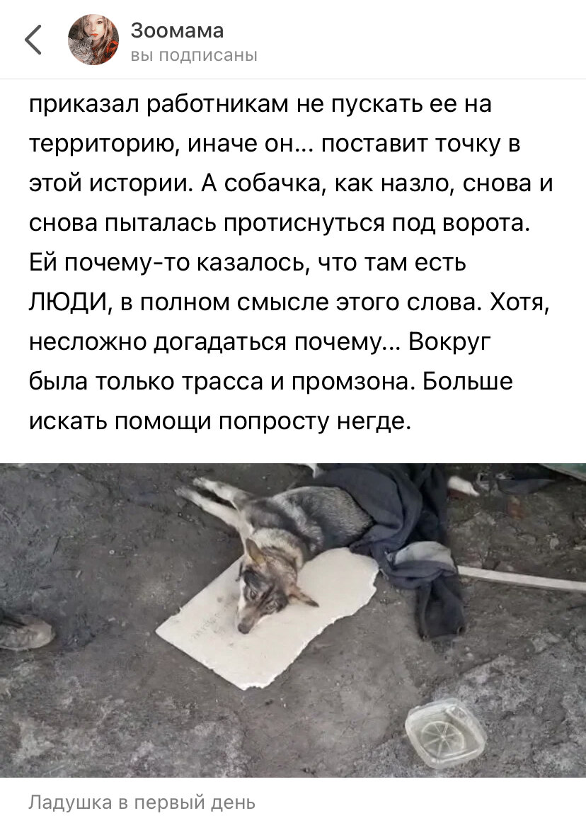 Узнав об этом, я решила, что должна спасти ее во что бы то ни стало, и забрала собачку под свое крыло, отправив на лечение в Москву. Я осознавала, что Ладуся тяжелый пациент, что ее лечение обойдется очень дорого и дом найти будет непросто, но глядя в эти несчастные глаза, так хотелось подарить ей шанс на жизнь, ведь у собак она тоже одна.... Видео спасения Ладушки👈