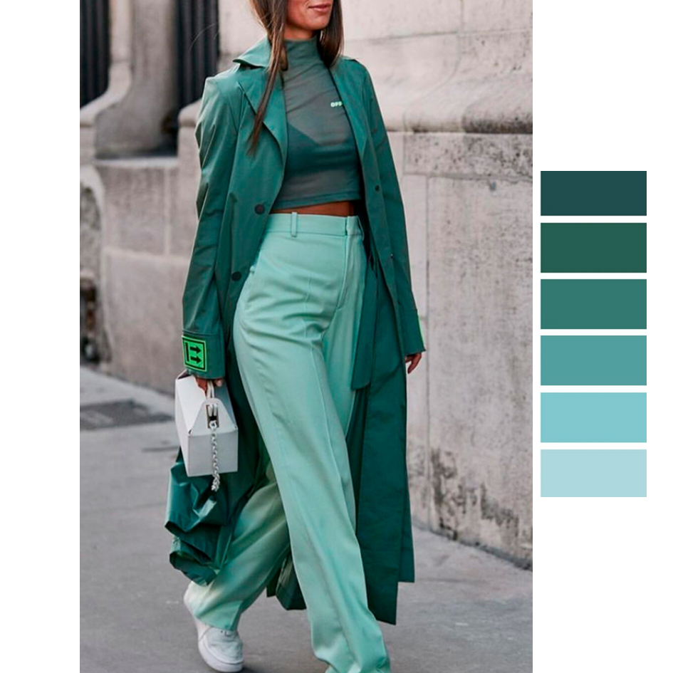 Продолжаем с вами учиться интересно и гармонично сочетать цвета. Смотрим следующий интересный вариант сочетания цвета - сочетание оттенков в одном лучике цветового круга. Этот способ называется «монохромная гармония» или «растяжка цвета». Берем один цвет, но в разной насыщенности: Для комплекта одежды лучше всего брать оттенки, расположенные не рядом (так они просто сольются), а через несколько оттенков. Вот так: И намного интереснее смотрится, когда к светлому оттенку берут темный или яркий, и наоборот. Заметили, что такое сочетание создает очень красивые, интересные образы! Они выглядят дорого, благородно, можно сказать, аристократически. Хороший совет: берите одежду в разной фактуре, как на фото ниже, и ваш комплект будет выглядеть еще интереснее. По пропорции мы можем взять разное количество каждого оттенка. Вот здесь, например, (фото ниже) светлого оттенка в комплекте только около 20%, всё остальное – более темный: Посмотрите еще примеры таких красивых сочетаний: Интересно? Захо