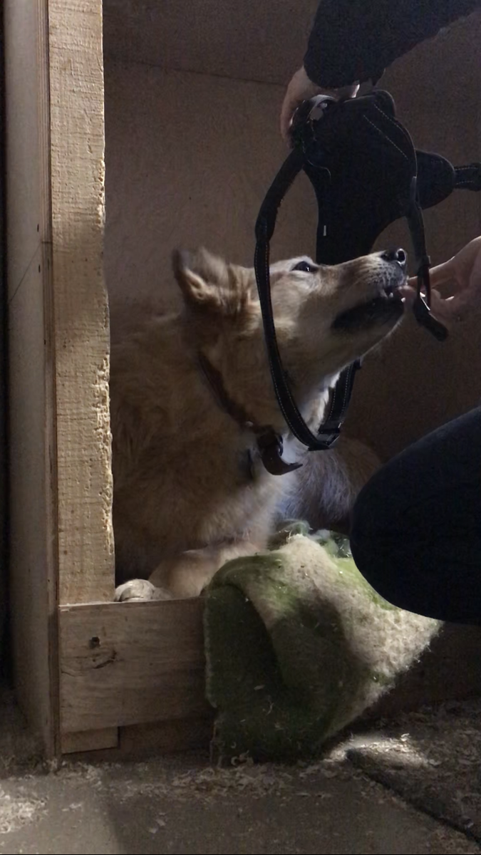 Если собака хотя бы один раз вывернулась из ошейника, с высокой долей вероятности она будет выворачиваться и впредь, а это опасно. В таком случае наилучшим решением будет приучать собака к прогулкам не в ошейнике, а в шлейке. Но если поводок один раз надел и потом только поводок к нему пристёгиваешь, то шлейку нужно каждый раз надевать и снимать. И в этом заключается основная сложность для нас с Вуди. Постепенно мы с ним учимся просовывать голову в шлейку. Для этого необходимо протягивать собаке вкусняшку, все ближе подвигая шлейку к морде. В какой-то момент накидываешь шлейку на шею и продолжаешь угощать собаку. А потом надо второе кольцо шлейки застегнуть на груди, а на этом шаге у Вуди начинается паника, и он начинает метаться. Так что пока мы все ещё топчемся на первом шаге, но настроены мы решительно! … продолжение следует …