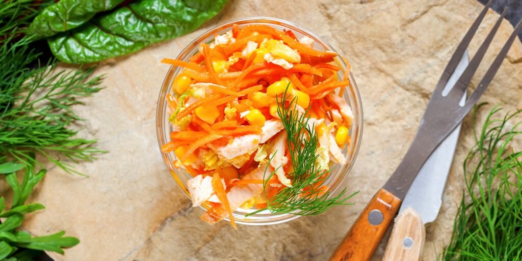 Ингредиенты Приготовление Нарежьте курицу небольшими кусочками. Добавьте морковь, кукурузу и майонез и хорошенько перемешайте. Перед подачей салат можно посыпать сухариками.