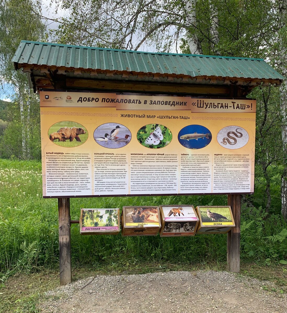 Наше путешествие по Башкортостану продолжается и сегодня мы едем в заповедник «Шульган-Таш». Шульган-Таш — государственный природный заповедник в Башкортостане, расположенный в пределах Бурзянского района. Заповедник славится своей уникальной флорой и фауной. На входе можно ознакомиться с некоторыми видами животных, которые встречаются на его территории. Шульган-Таш упоминается во многих мифах и легендах, одна из которых – эпос Урал-батыр. Стенды с ним периодически встречаются на всем маршруте. Одна из визитных карточек заповедника – бортевой мед. Чем же он отличается от обычного? Дело в том, что собирает такой мед пчела бурзянка, которая, по сравнению с обычной, дикая. Такой мед содержит в себе все продукты пчеловодства, поэтому он намного полезнее. Если пройти чуть дальше, то вам встретится музей «Пчелиный лес», в котором могут интересно рассказать о том, как добывают этот уникальный мед, который добывается только здесь. Вторая визитная карточка этого заповедника – Капова пещера,