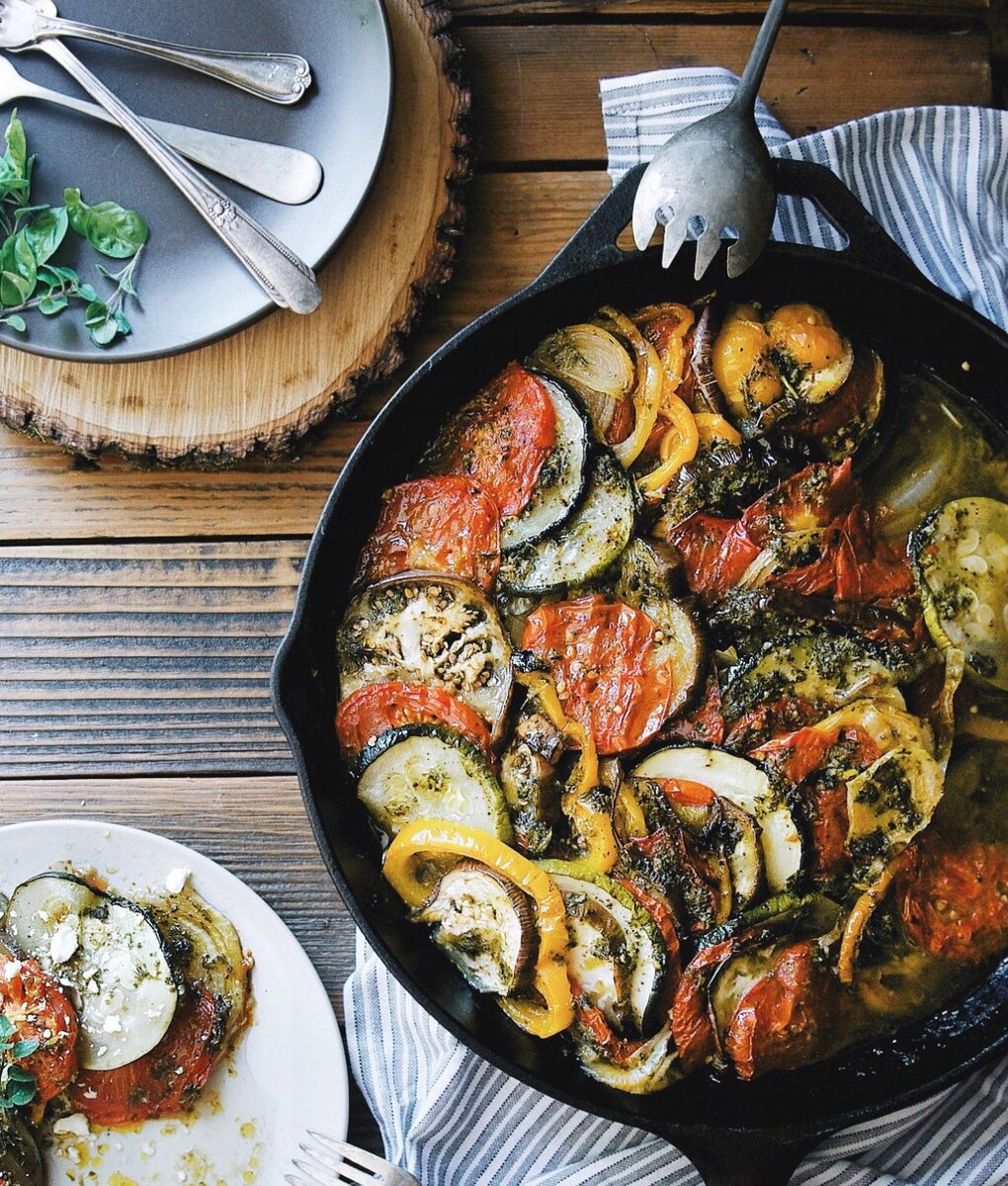 Очень красочное блюдо! В нем только овощи и пряности. Готовьте его так же, как готовили милые персонажи из знаменитого мультфильма. Соус пеперад: Перец болгарский — 2шт Помидоры — 2шт Лук — 1шт Чеснок — 2 зубчика Тимьян, лавровый лист, базилик, соль и перец — по вкусу Оливковое масло — 2 ст.л. для жарки Рататуй: Цукини — 1шт Кабачок — 1шт Баклажан — 1шт Помидор — 3-4 шт Оливковое масло — 2 ст.л Чеснок, тимьян, соль, перец — по вкусу Начнем с подготовки овощей. Нужно запечь болгарский перец в духовке. Очистить его от семечек и вымыть под. Отправить в разогретую духовку до 200 градусов минут на 20, когда появится запечённая кожица - перец готов. Также для соуса нужно очистить от кожицы и помидоры. Для этого нужно залить их на пару минут кипятком. Нарезать кубиком очищенные от кожицы помидоры. Затем мелко шинкуем лук и чеснок. Ставим на плиту сковородку, наливаем оливковое масло. Сначала обжарить лук до прозрачности, а затем добавим к нему и чеснок. Так как чеснок очен