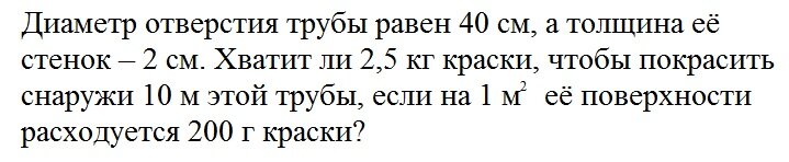 Площадь боковой поверхности цилиндра Уважаемые мамы и папы, дедушки и бабушки! Предлагаю решение задачи 775 из 7-го издания учебника по математике для 6-го класса авторов А. Г. Мерзляка, В. Б. Полонского и М. С. Якира под редакцией. В. Е Подольского. Условие задачи: Решение: Надо найти, на какую площадь хватит 2,5 кг краски и сравнить с площадью поверхности трубы. С точки зрения геометрии труба – это цилиндр. Чтобы найти площадь боковой поверхности цилиндра, надо длину окружности цилиндра умножить на его высоту (§26). Высота цилиндра – 10 м. Формула длины окружности (§25): В школе при вычислениях число обычно π берут за 3,14 (округляют до сотых). Радиус трубы состоит из радиуса отверстия и толщины стенок. Диаметр окружности всегда в 2 раза больше радиуса, поэтому: 13,816 > 13,5 Ответ: не хватит, так как площадь поверхности трубы больше, чем можно покрасить двумя с половиной килограммами краски.