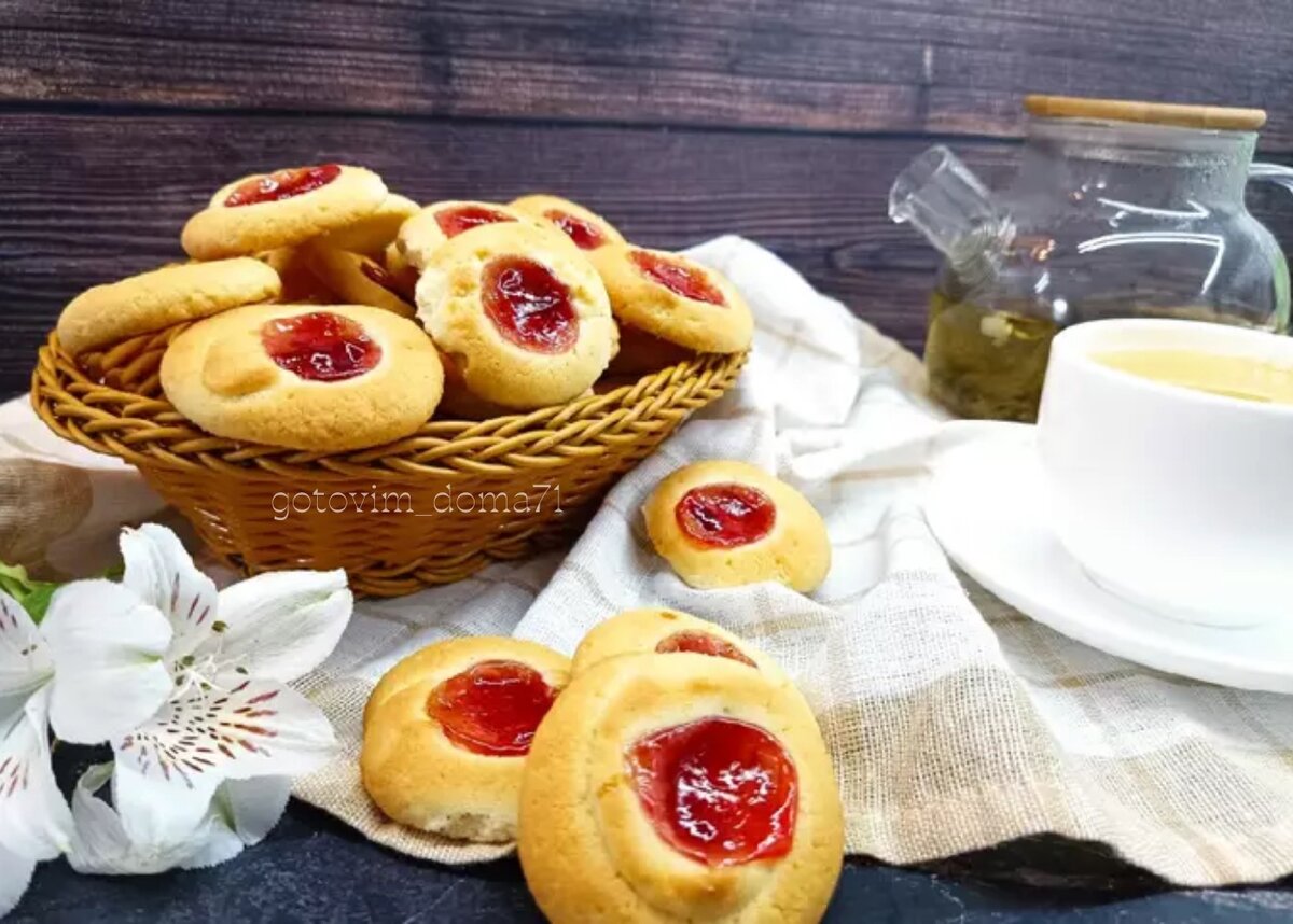 Приятного чаепития! Ингредиенты: 200 г сливочного масла 40 г белка из куриных яиц 80 г сахарной пудры 280 г муки 8 г ванильного сахара джем с пектином (клубничный) #выпечка #рецептывдуховке #курабье #печенье #еда
